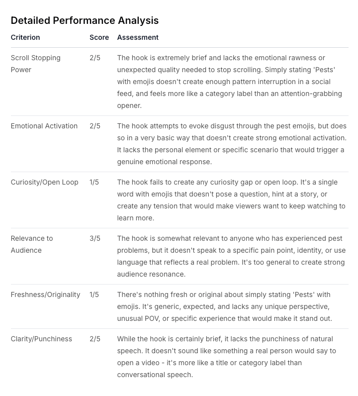 The agent will analyze your selected hookand you’ll receive a detailed perfomance analysis